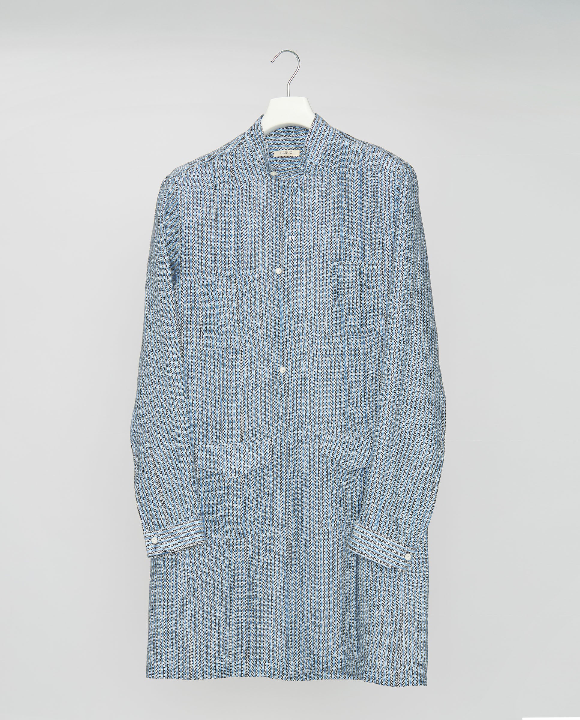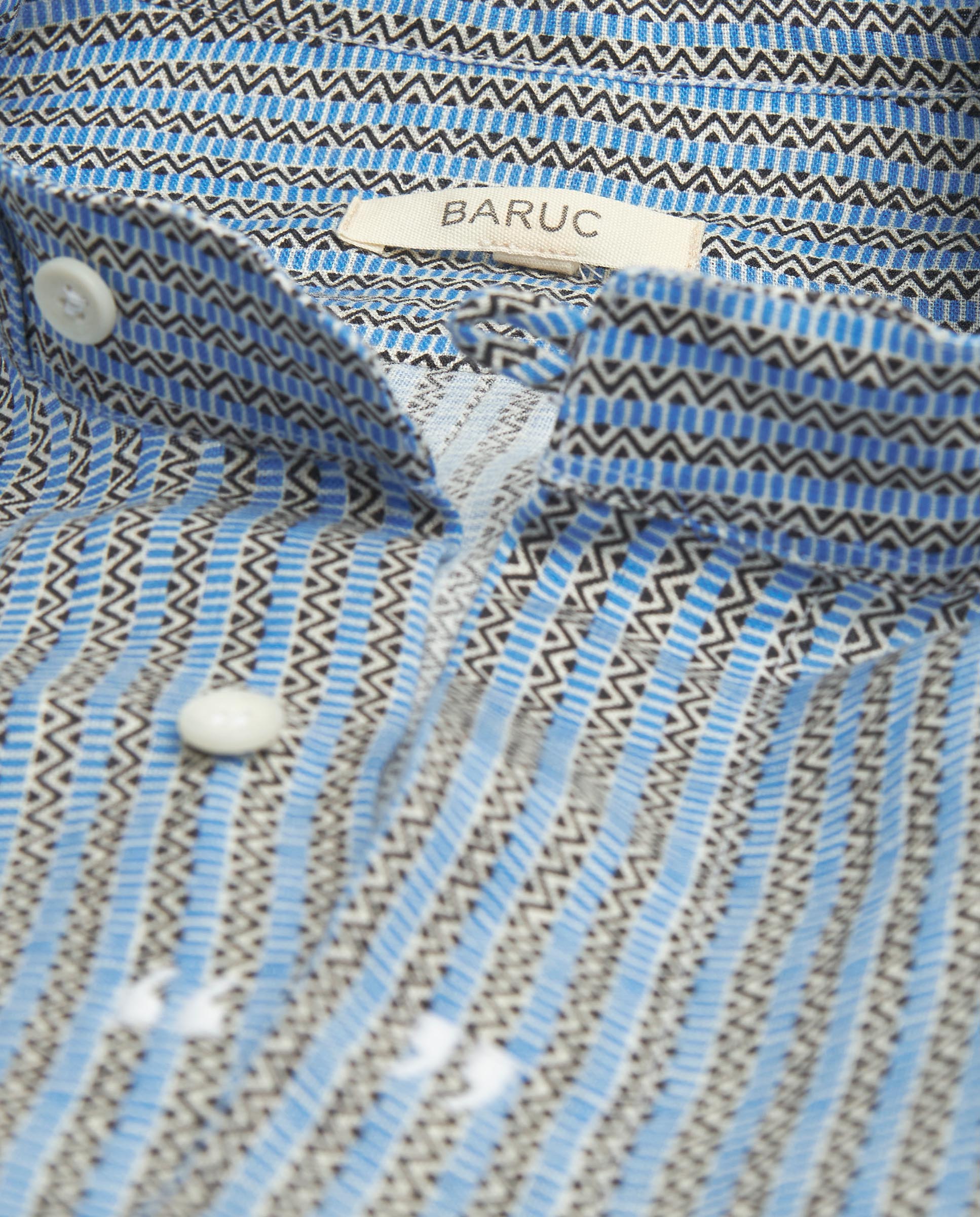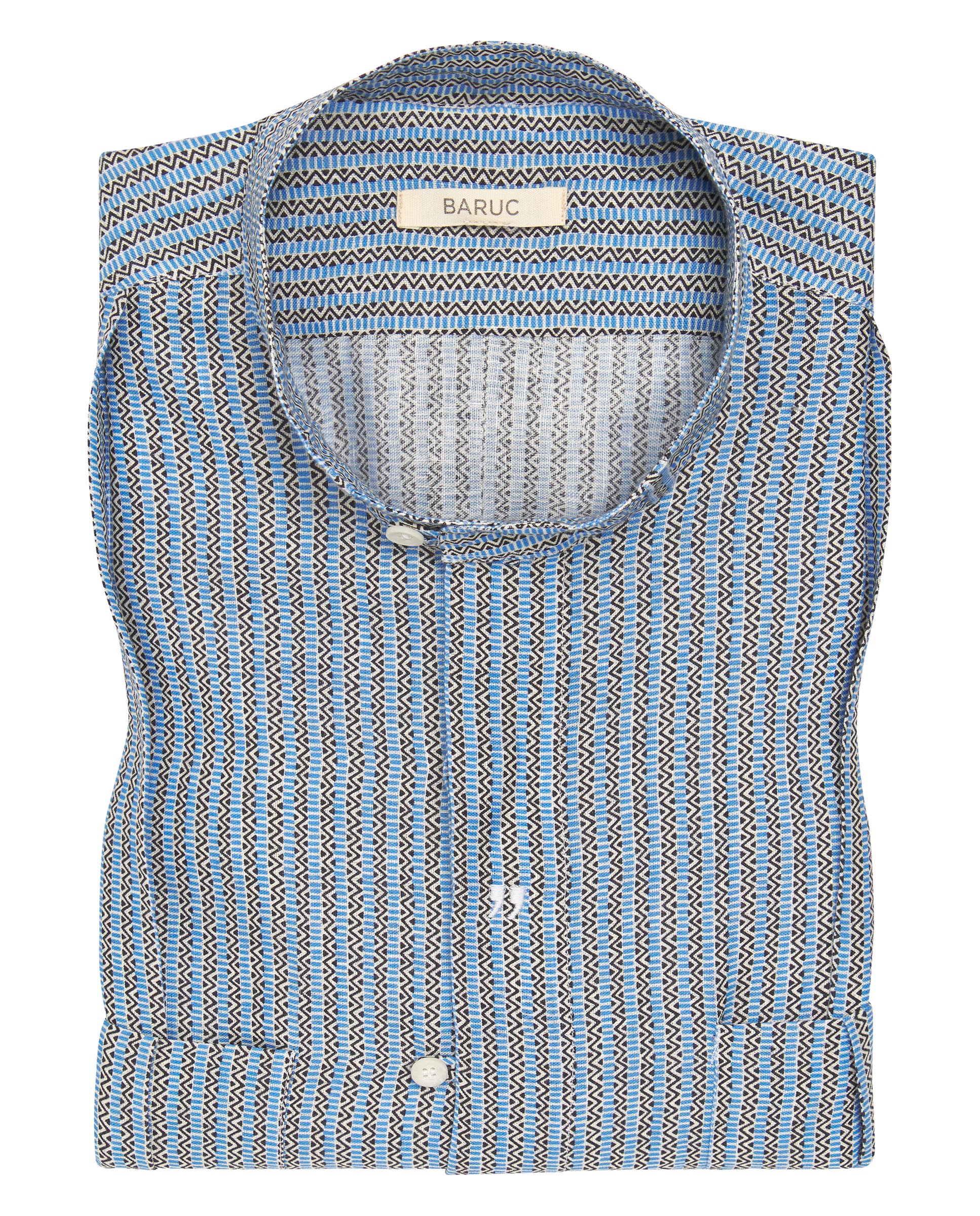 BARUC's long Belize Guayabera in sea blue print linen, pleated front, side vents and a secret pocket inside.