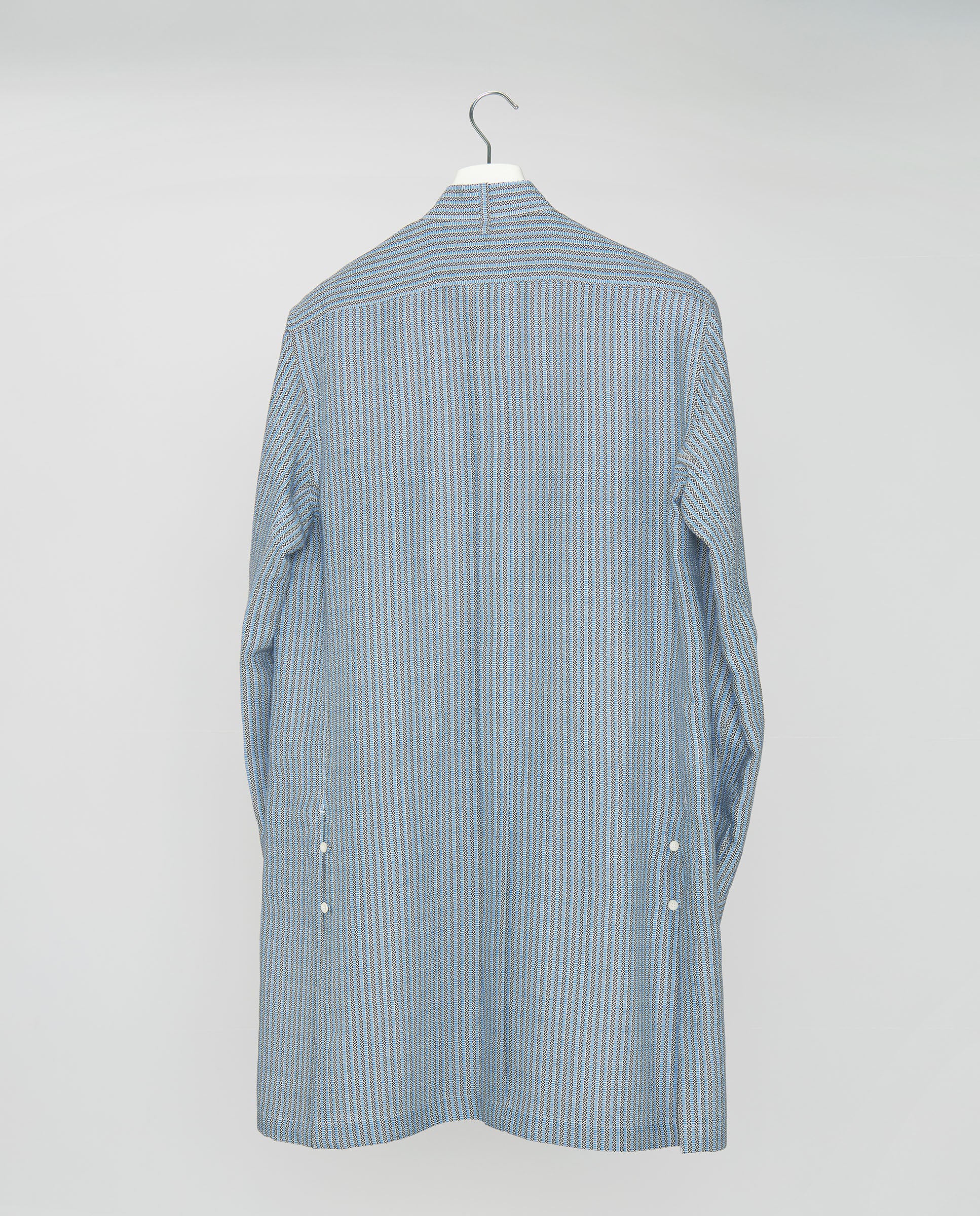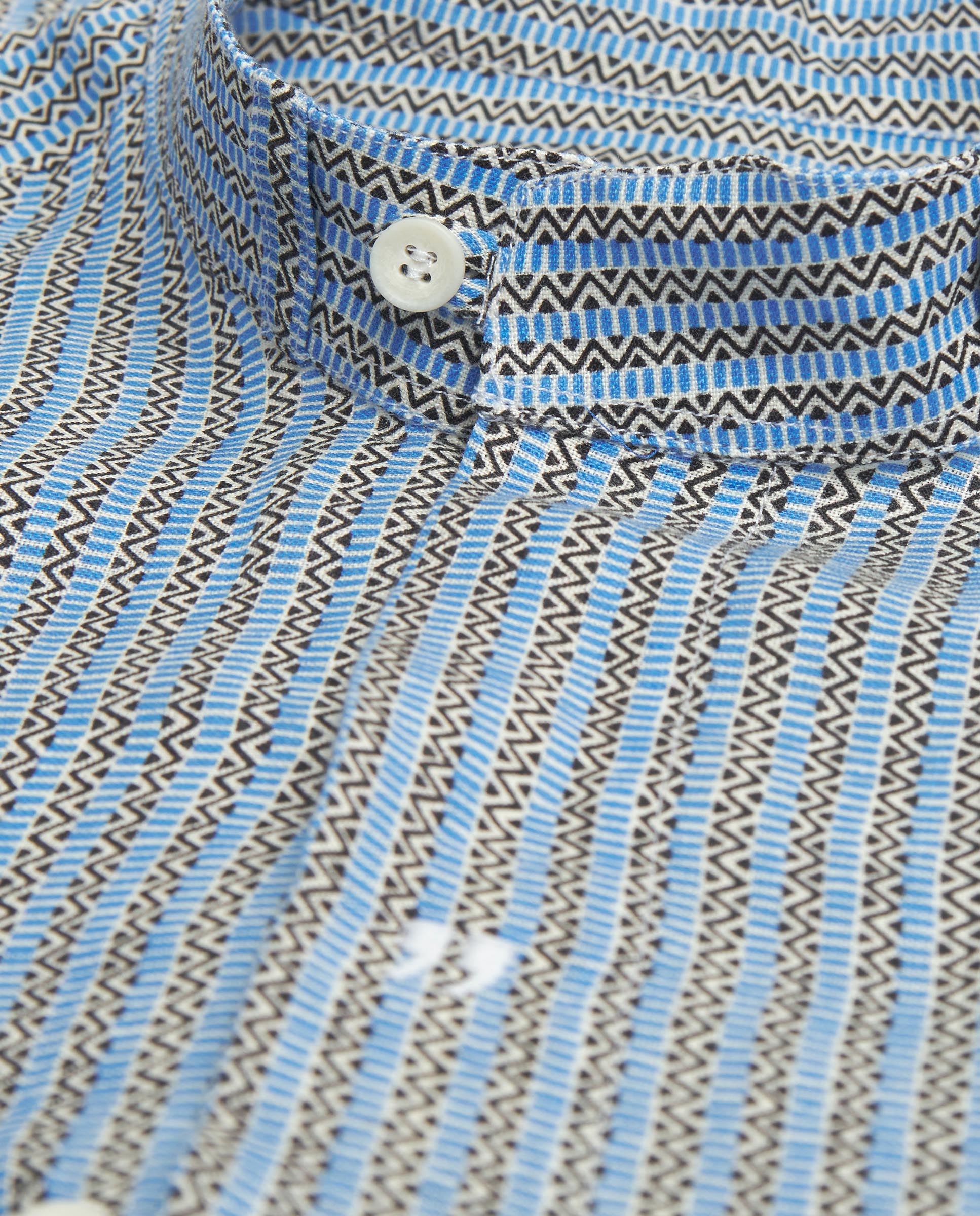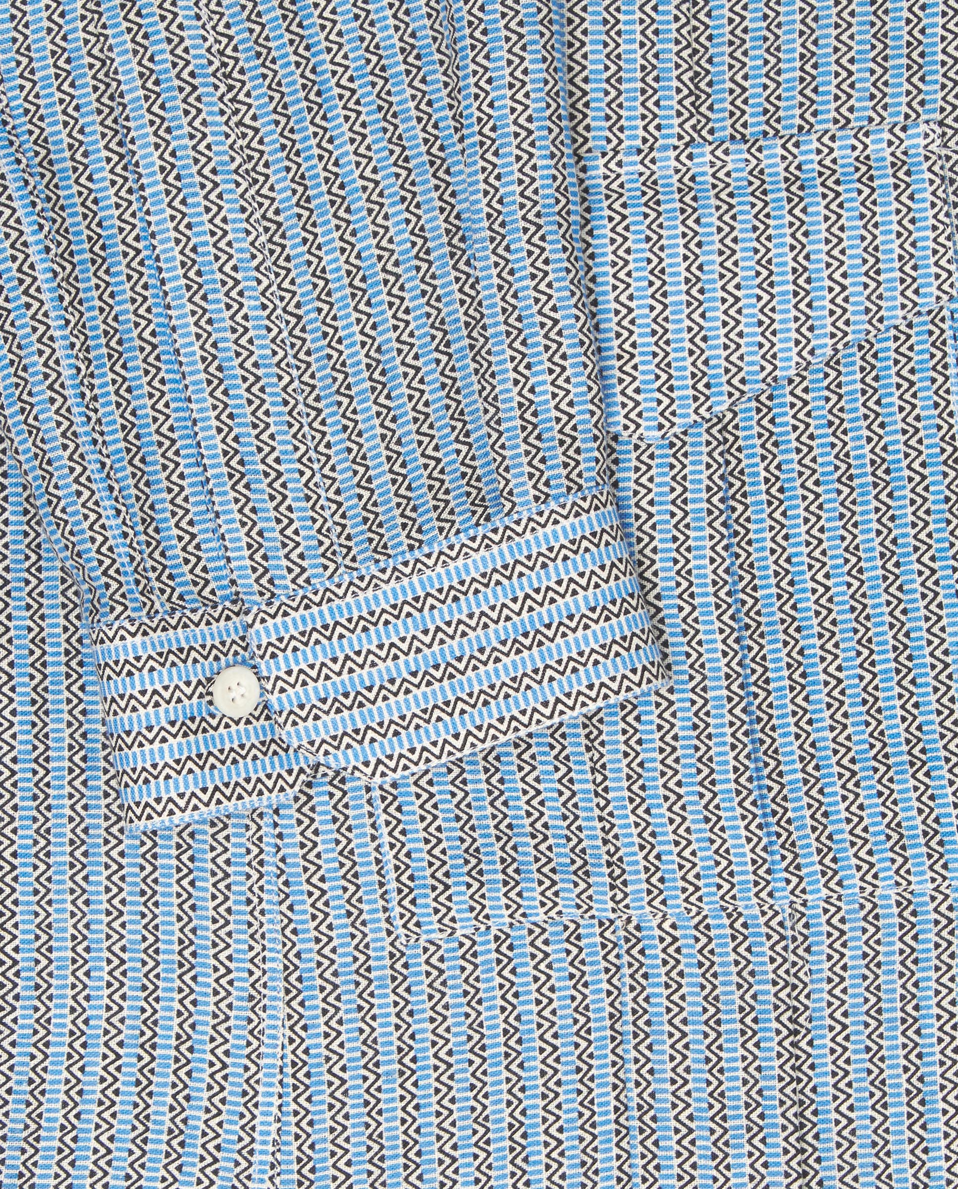 BARUC's long Belize Guayabera in sea blue print linen, pleated front, side vents and a secret pocket inside.