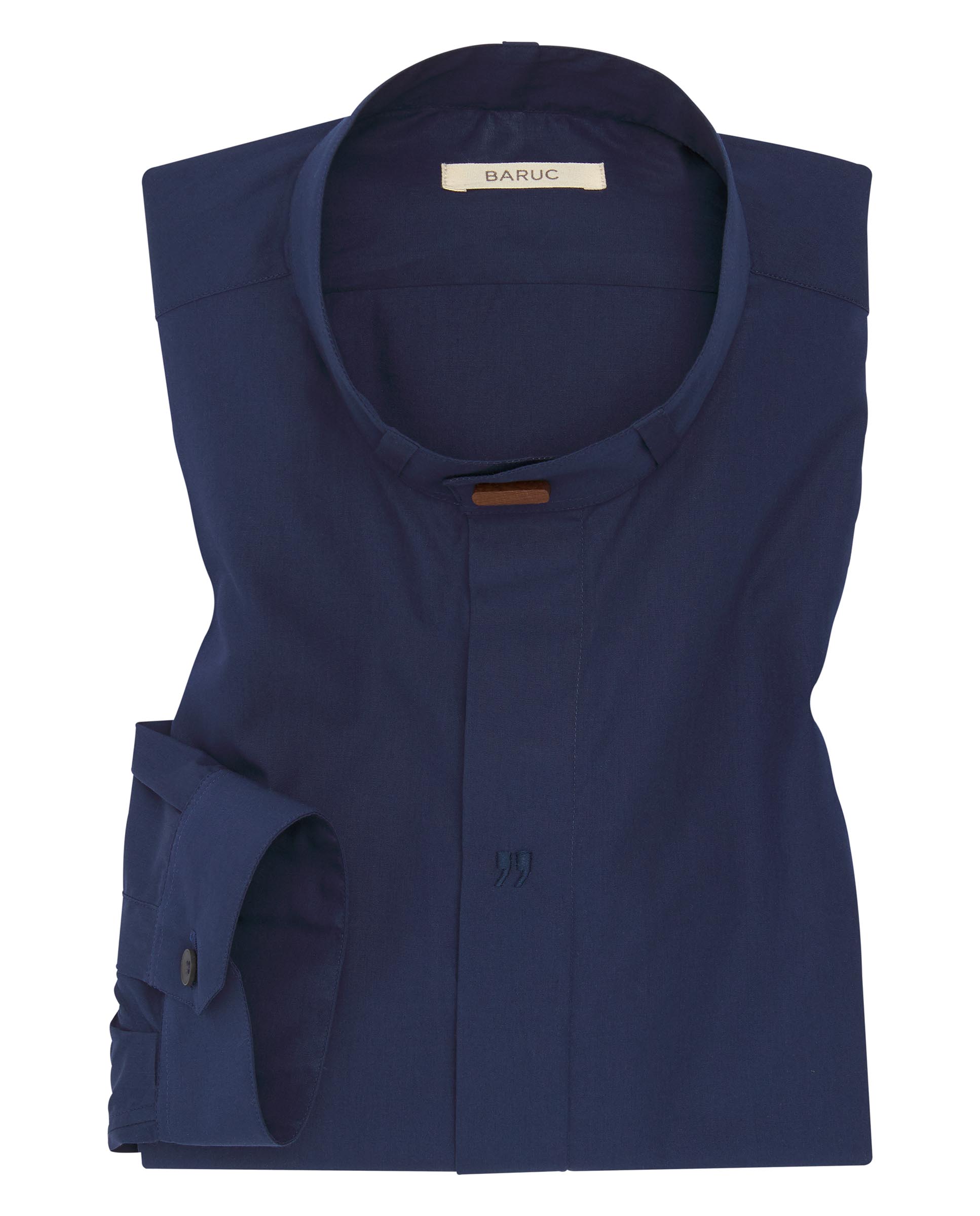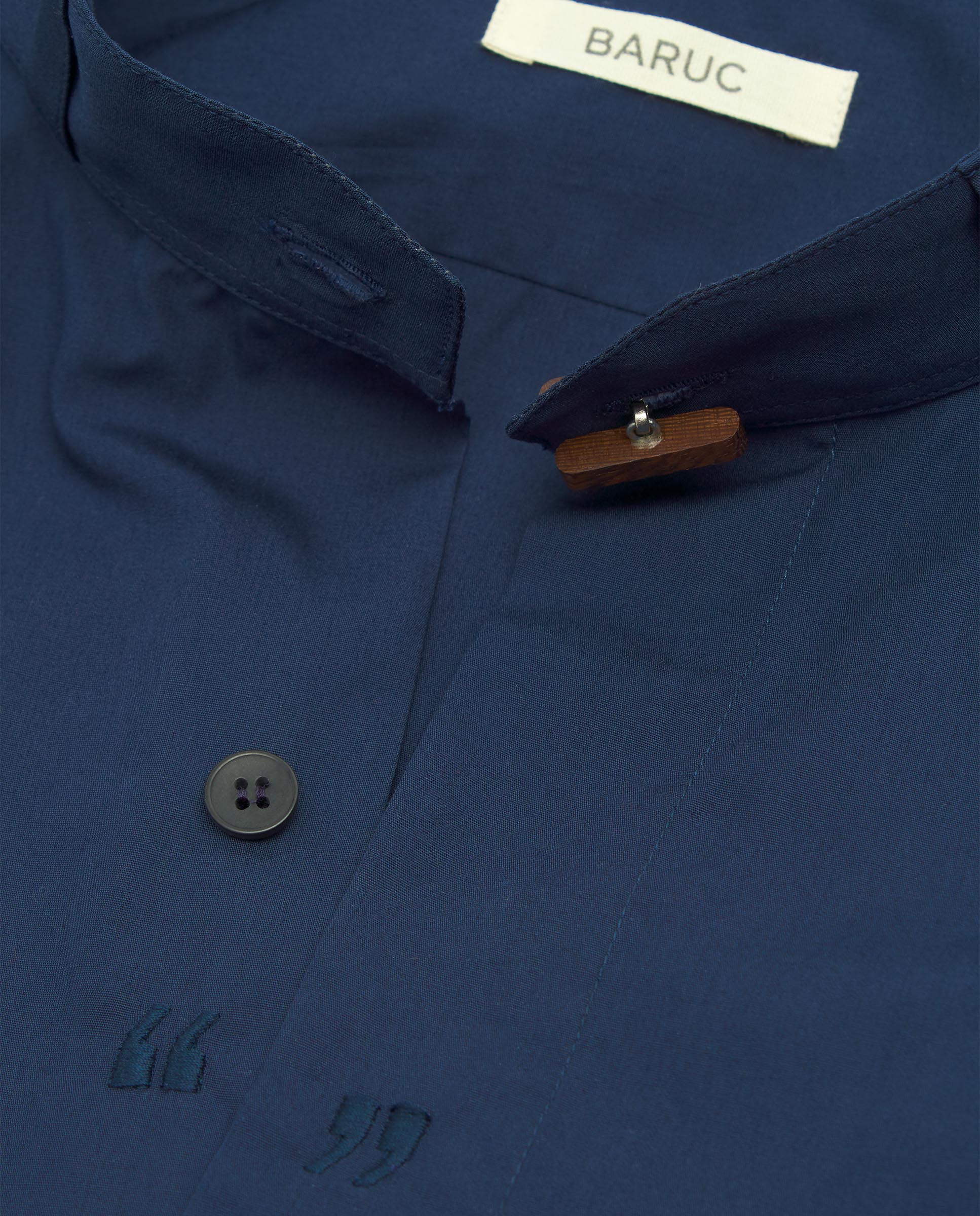 The shirt is the most universal modern garment worn by men and women all over the world. This model is the first piece created by BARUC, defining the “here and now” of his design paradigm; a collar to be worn without tie, hidden front buttons, closed cuffs with a hidden button, or with cufflinks, not too fitted, and able to be worn either tucked in, or comfortably loose outside due to its straight hem with vents on the sides.